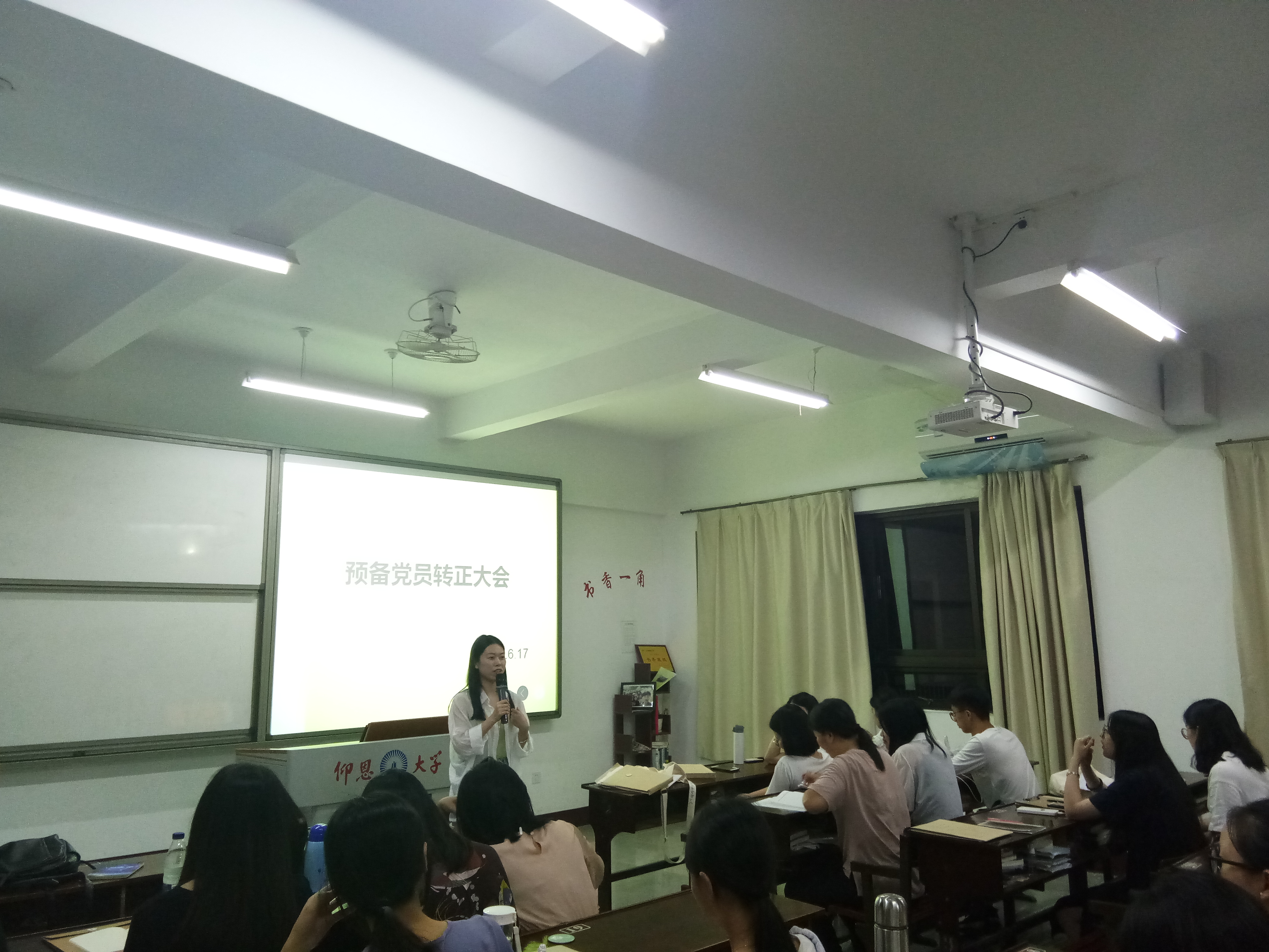 入党联系人发言 此次会议由位美娅老师主持,大会共有四项流程。一、转正党员上台发表言论;二、入党联系人对转正党员进行发言;三、转正党员身边熟悉的人进行发表言论;四、在场正式党员进行举手表决。此次林雪丹、李心绵、胡美威、胡嘉欣、叶亦舒、庄词荣和陈倩七为预备党员正式转正为正式党员。