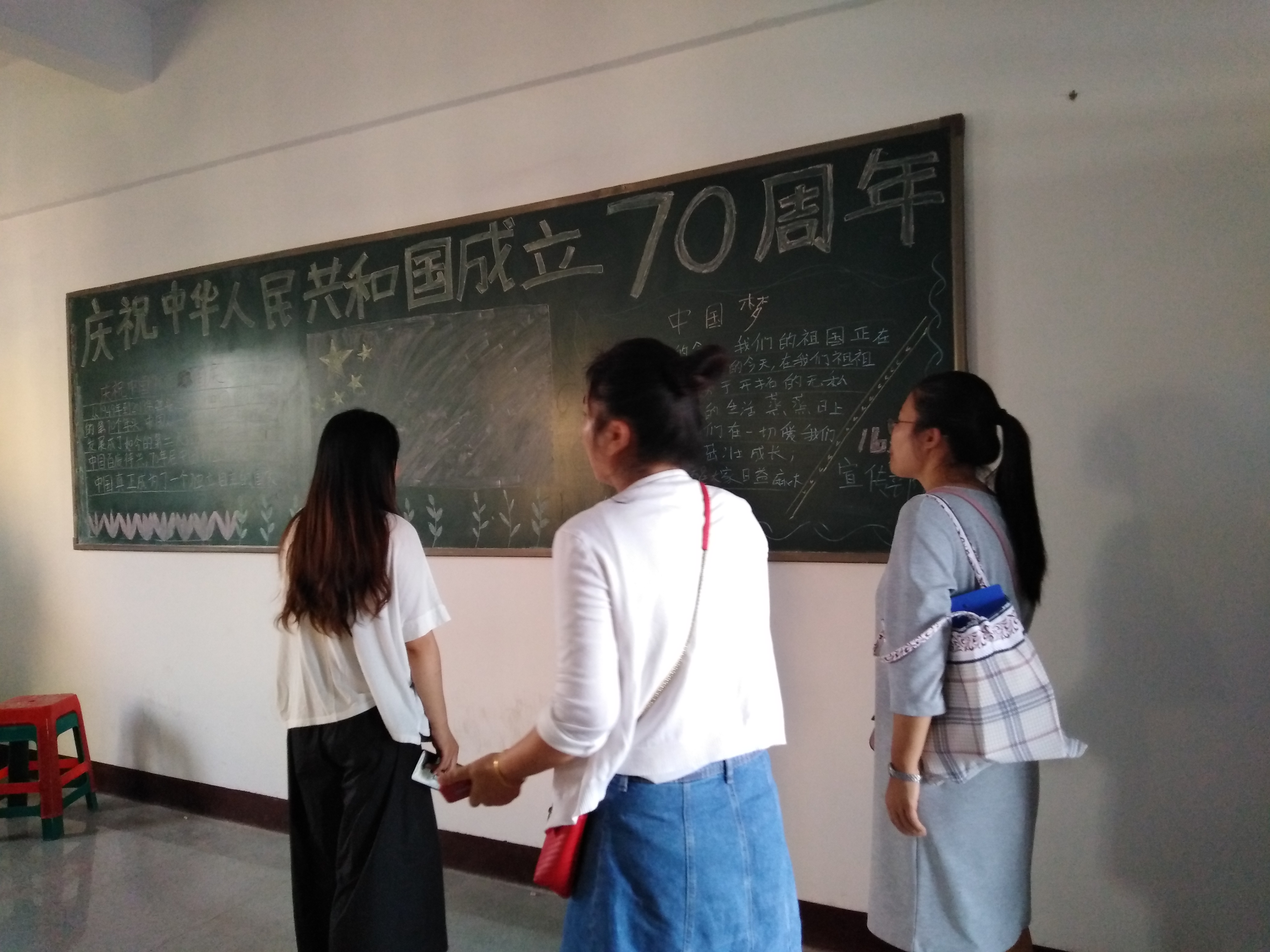 检查黑板报 为了庆祝中华人民共和国成立七十周年,我院各班级响应学校号召,制作主题板报。学院组织老师通过对同学们黑板报制作的检查和鉴赏,了解学院学子的思想动态,本着以评促改、以评促建的原则,推动黑板报制作水平的提高和加强学生们的爱国主义教育。