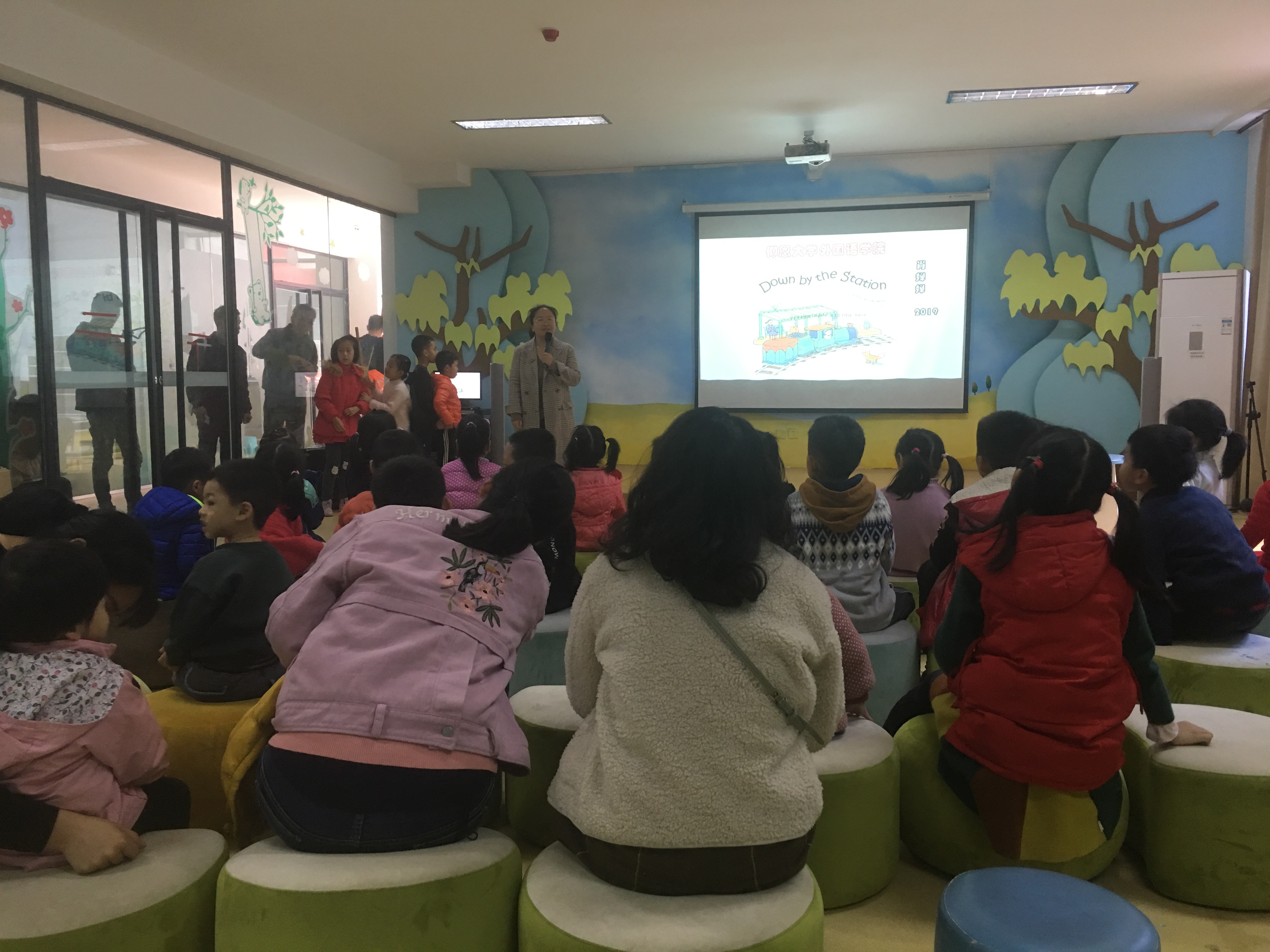 肖婵婵老师讲解《Down by the Station》 然后,肖婵婵老师讲解的是英语绘本“Down by the Station ”。该绘本围绕着交通工具,描述清晨火车站里一派忙碌的景象。书中出现了很多交通工具,以及这些交通工具所发出的声音。小朋友们可以在书中学到很多有关交通工具的英文以及它们发出的声音,还可以学到很多英语惯用的说法,比如“到车站”是down by the station,“排成排”all in a row, “出发咯”是off we go等等。肖老师还邀请了四位小朋友参与绘本的讲解。小朋友们表现得落落大方,标准的英语发音博得了现场阵阵掌声。