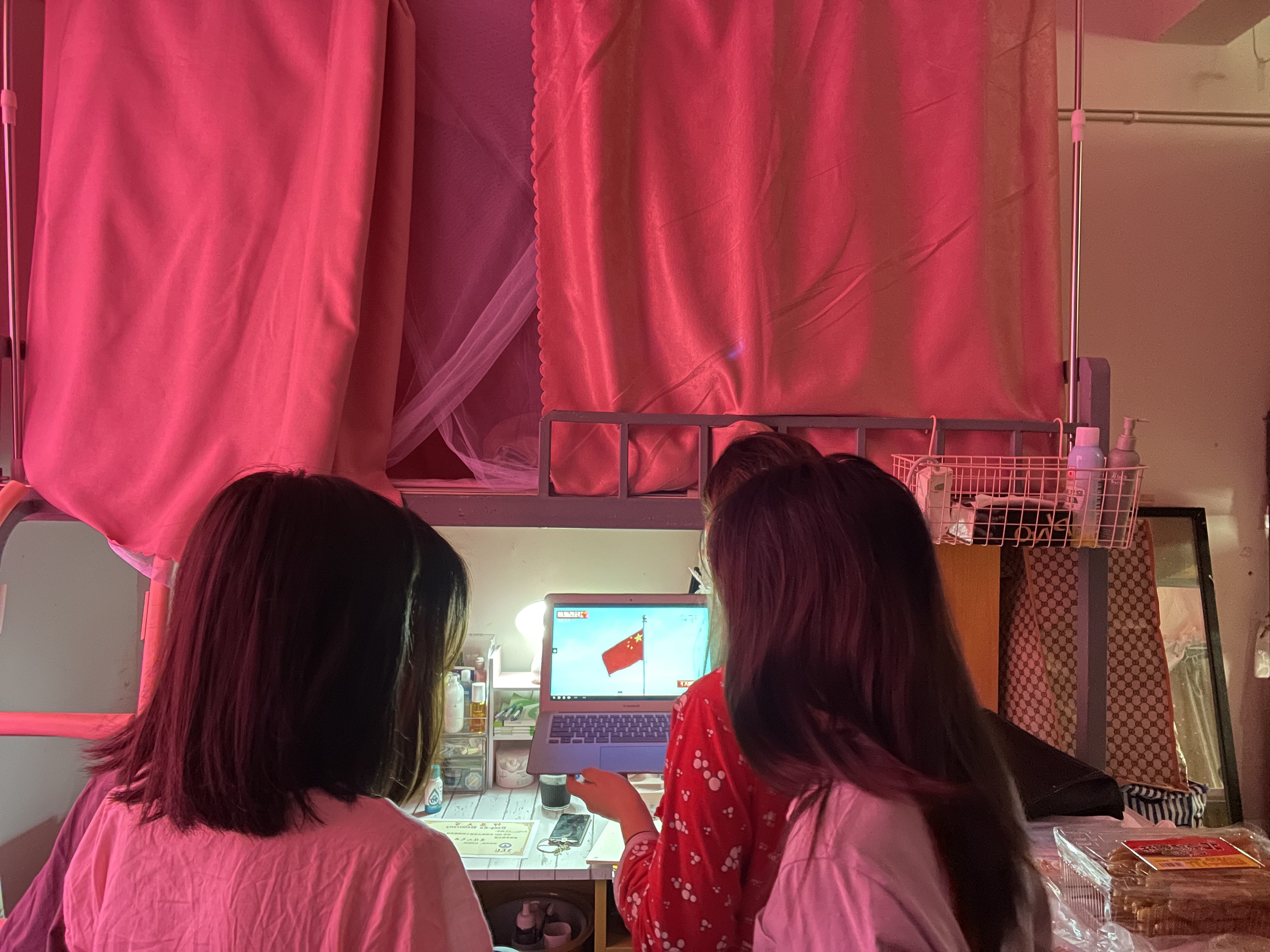 观看“云直播”升旗仪式 上午8:00,在校生们在宿舍线上观看学校国庆升旗仪式,共同庆祝新中国72周年华诞。伴随雄壮的国歌响起,五星红旗迎着晨光冉冉升起,全体学生肃然而立,向国旗行注目礼,表达对伟大祖国的无限敬意和深深祝福。