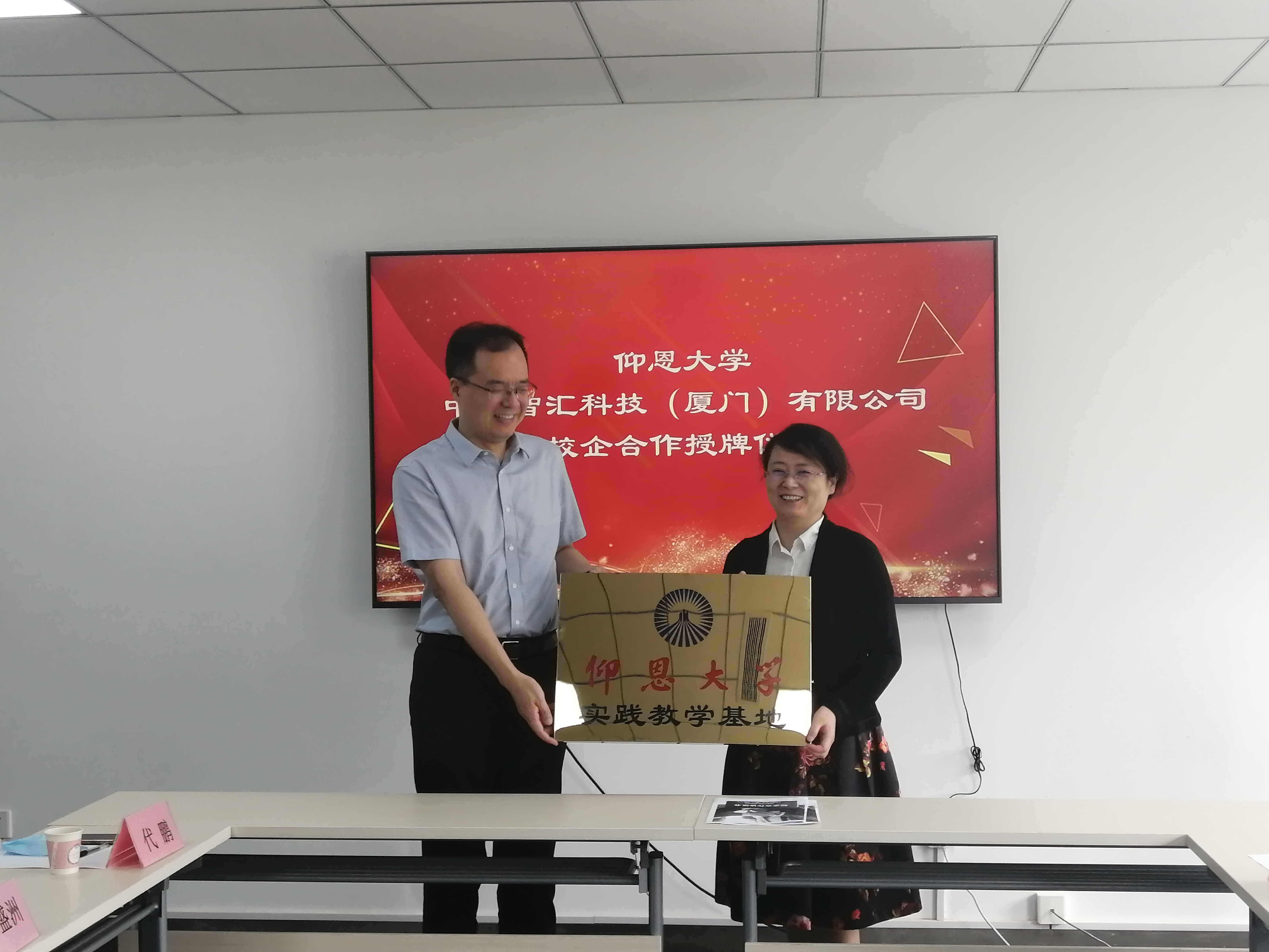 之后,一行人到达厦门中语智汇有限公司,与董事长叶麟等人进行了亲切的交谈。和与会企业进行了就业实习基地签约和挂牌仪式;鲍莹玉代表学校向行业导师代鹏颁发聘书。