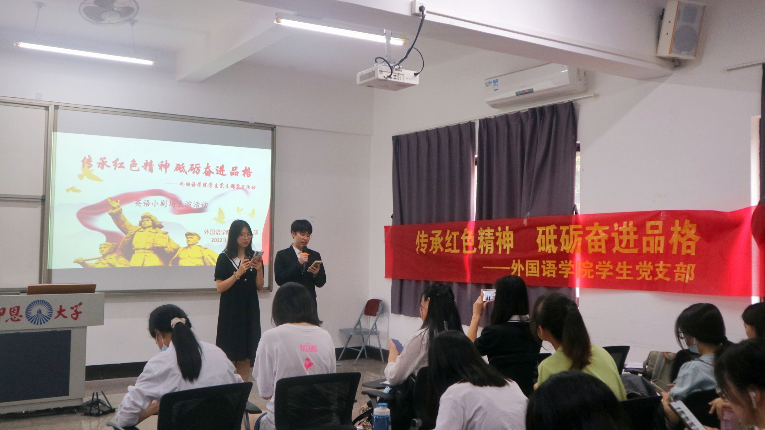 2022年6月15日下午best365官网中文版登录学生党支部在普照教学楼205教室开展 “传承红色精神,砥砺奋进品格”主题党日活动。本次主题党日活动包含两个主要部分:“传承红色文化,弘扬红色精神”主题英语小剧场表演活动和“红色盲盒,传承红色基因”活动。支部书记许淑琴老师,支部组织委员位美娅老师到场并作为评委老师,best365官网中文版登录全体在校学生党员进行活动表演,以及21级全体积极分子到场观看学习。