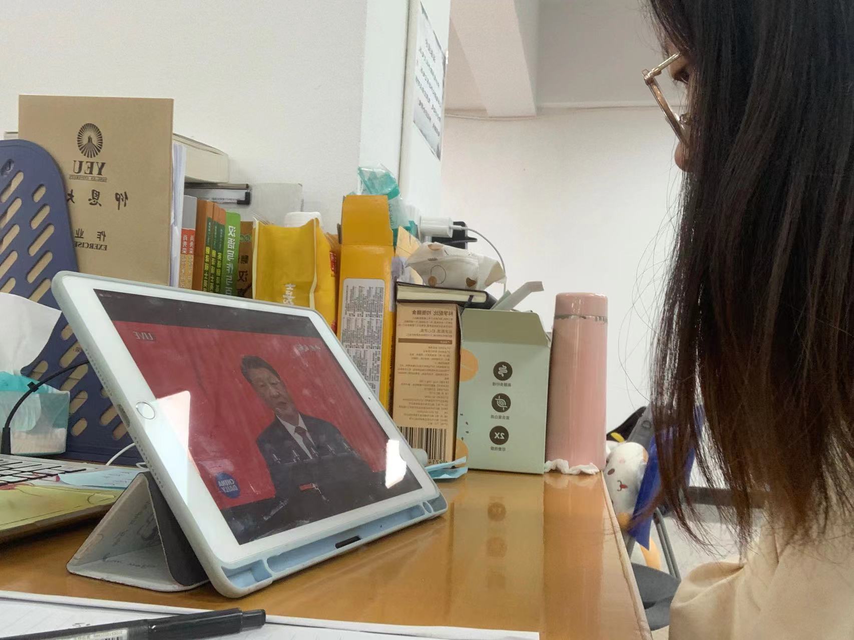 观看网络直播 学生们观看后,进行了热烈议论。22级英语2班的同学表示通过观看习近平总书记的报告,他们深刻明确了中国的发展方向、中心任务。作为大学生,身处新时代,要坚定不移听党话、跟党走,胸怀梦想、增强本领,做有理想、敢担当、能吃苦、肯奋斗的好青年。