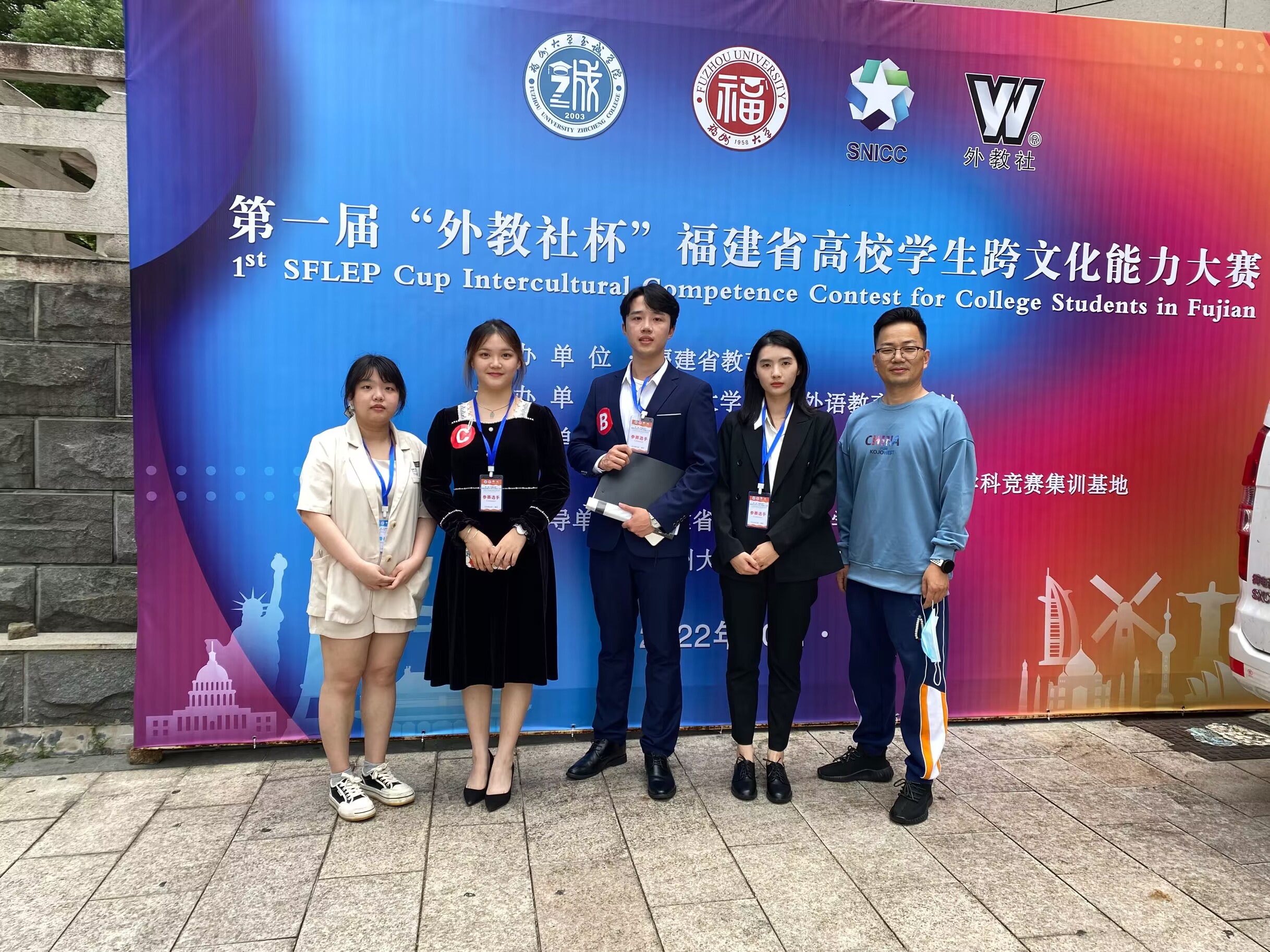获奖合影留念 备赛期间,团队成员学习跨文化知识理论要点,撰写跨文化交流冲突论述文稿及展示台本,排练舞台展示及最后两轮问答。