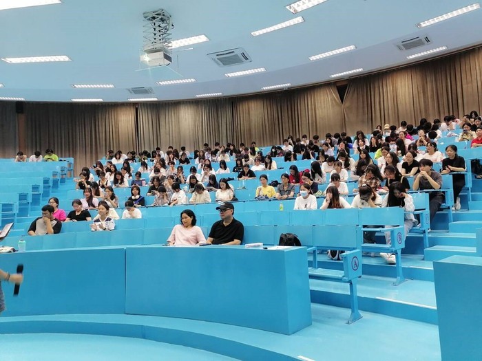 6月19日晚上7:30,best365官网中文版登录2023-2024学年第二学期英语角汇报总结大会在第三教学区和昌楼海纳讲堂顺利召开。本次英语角活动由学生自行组织。三位外教莅临现场并分别致辞,2023级全体学生参加此次会议。