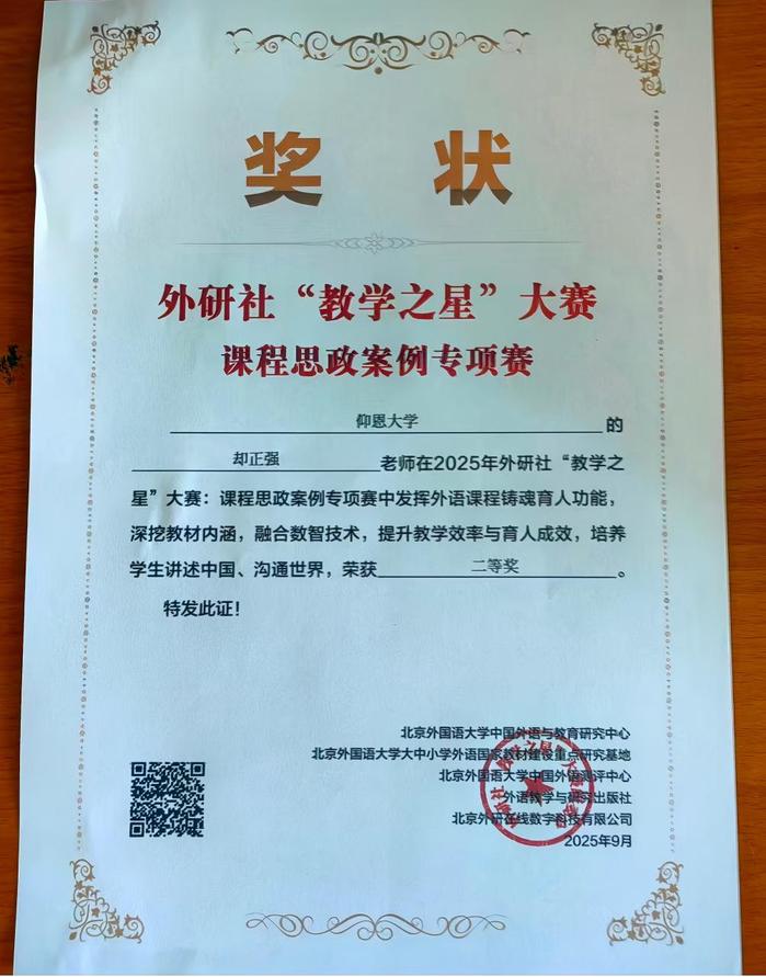 近日,2025年外研社“教学之星”大赛(课程思政案例专项赛)评选结果揭晓。我院却正强老师凭借其出色的课程思政教学案例,在比赛中荣获福建赛区二等奖。