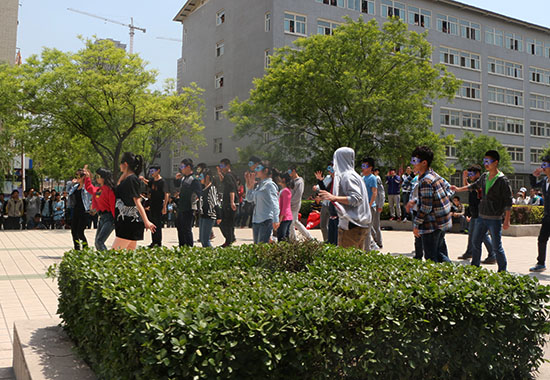 2014年5月6日午12点20分许,计算机科学与技术学院、新葡的京集团35222vip艺术团组织部分同学在迎西校区智林广场开展了一次“快闪”活动。本次活动以“闪动青春”为主题,展示大学生青春活力的同时为母校生日献礼。